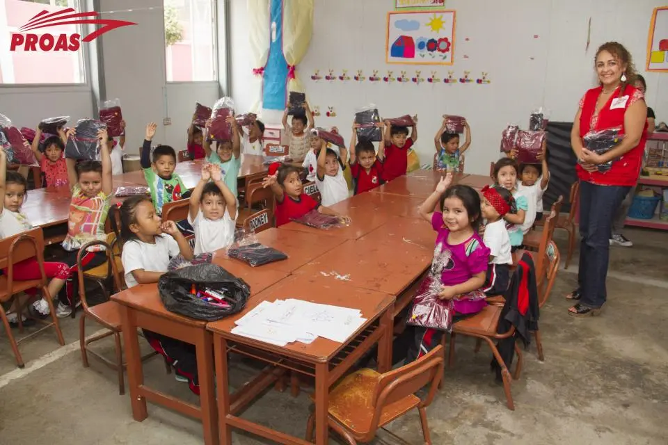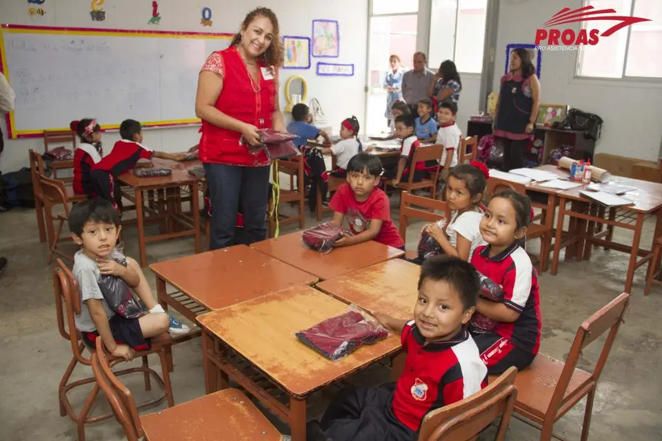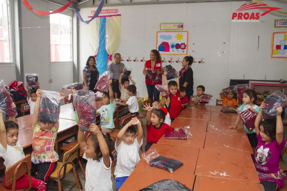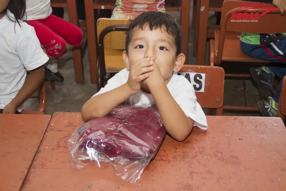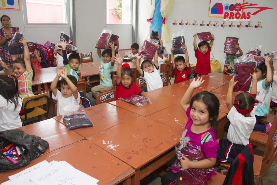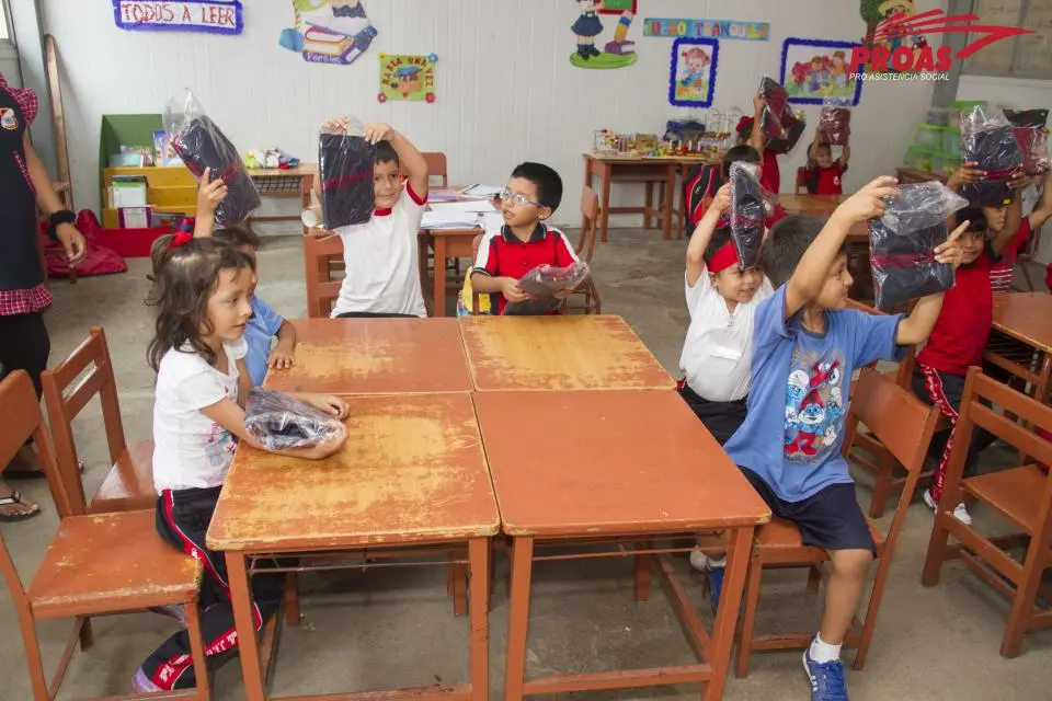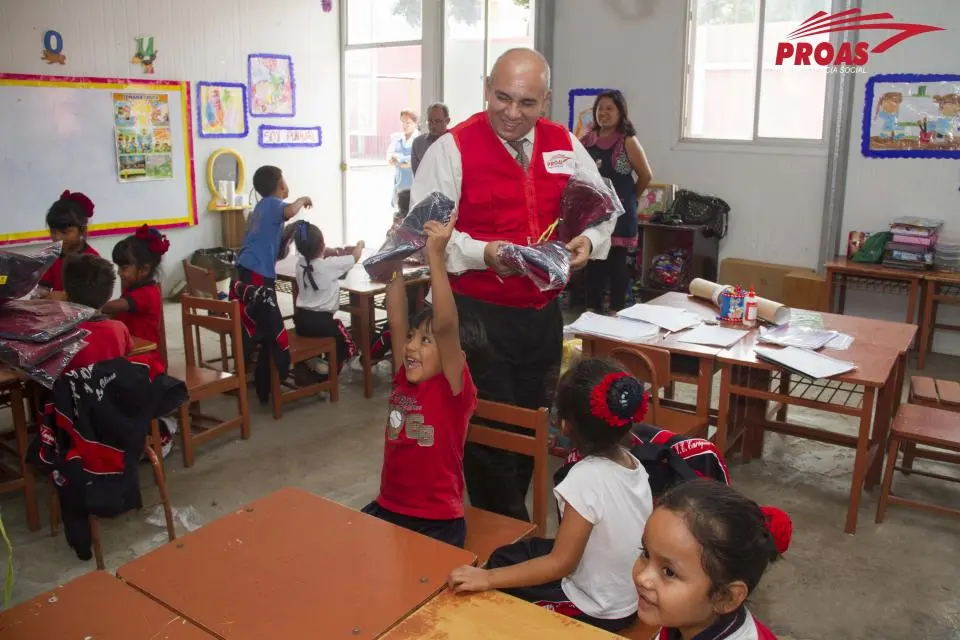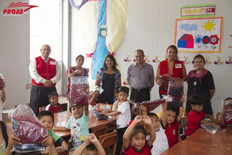 Los niños de 3 a 5 años del Colegio Enrique Guzmán y Valle de Los Olivos (ubicado en el Parque Naranjal) fueron beneficiados con ropa deportiva de verano para que puedan sentirse más cómodos en esta temporada de calor intenso. Más de un centenar de niños recibieron con alegría sus obsequios. En la vista la Sra. Teresa Altamirano y Joaquín Ortiz, de Proas, junto con la Sub Directora, Srta. Lilian Letona Pérez y el Sr. Pablo Portal Reátegui, Director de dicho centro de estudios.