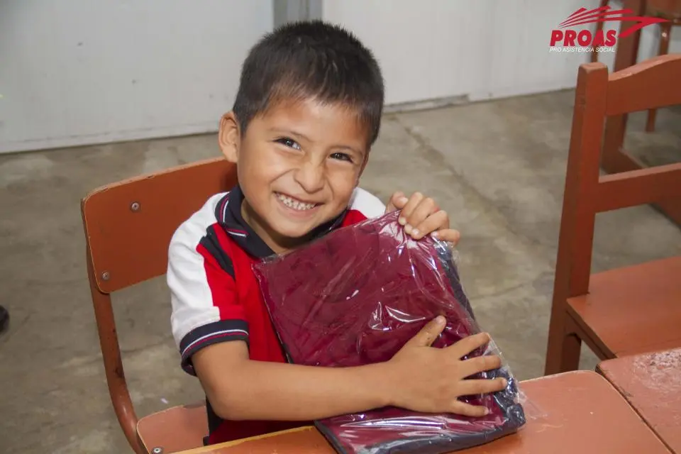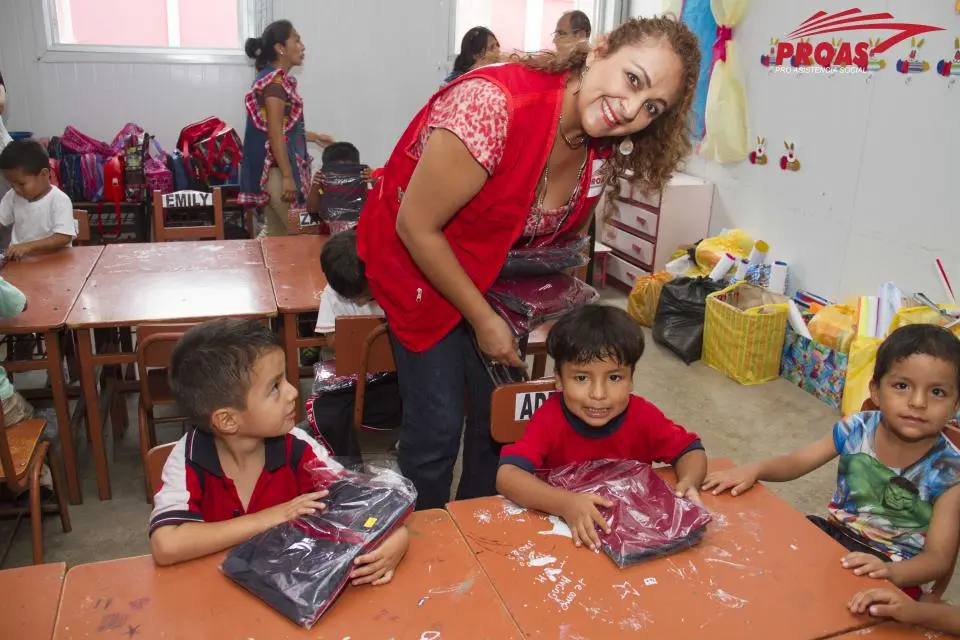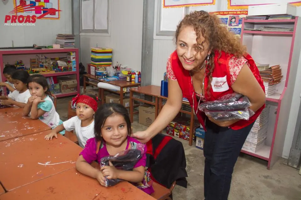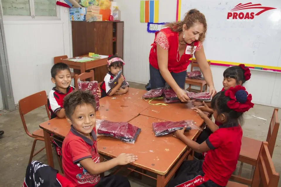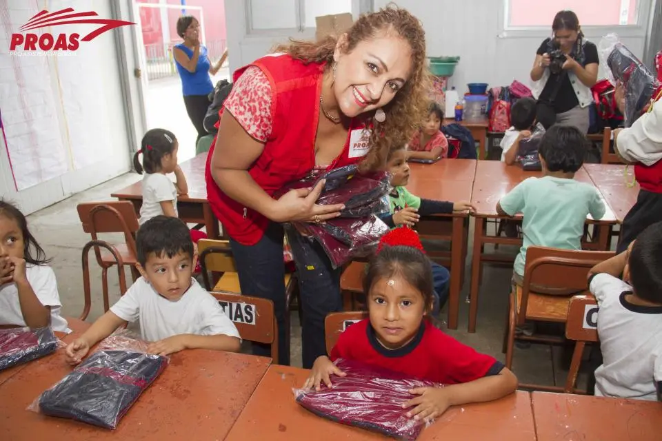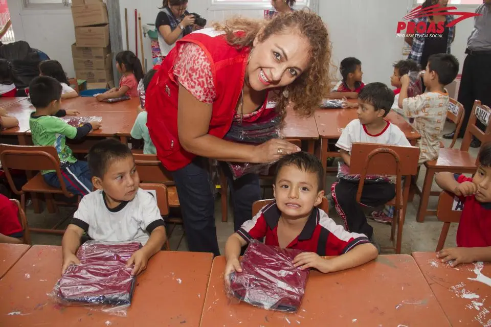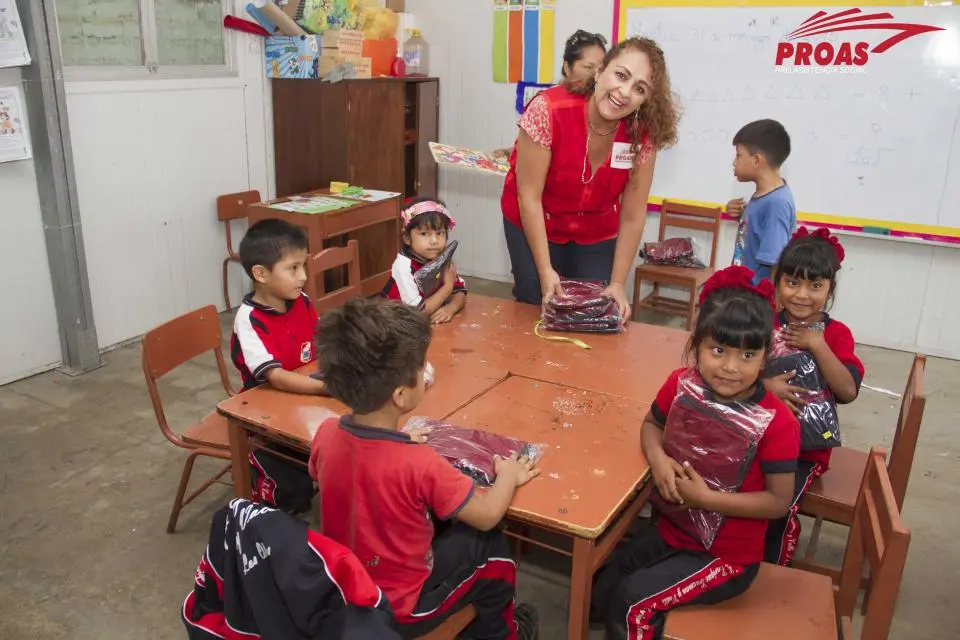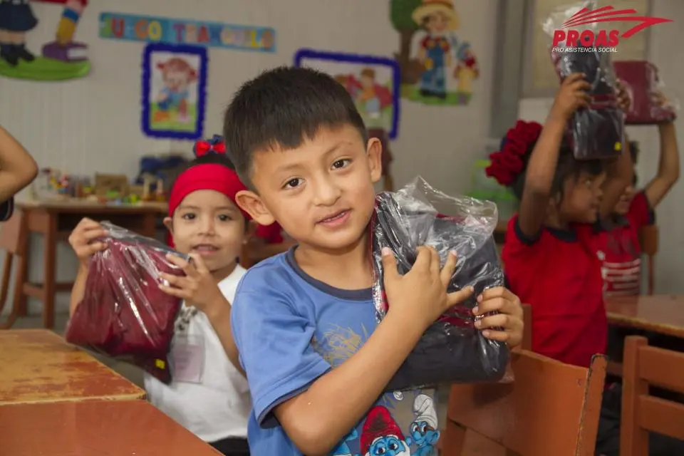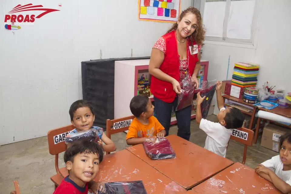 Los niños de 3 a 5 años del Colegio Enrique Guzmán y Valle de Los Olivos (ubicado en el Parque Naranjal) fueron beneficiados con ropa deportiva de verano para que puedan sentirse más cómodos en esta temporada de calor intenso. Más de un centenar de niños recibieron con alegría sus obsequios. En la vista la Sra. Teresa Altamirano y Joaquín Ortiz, de Proas, junto con la Sub Directora, Srta. Lilian Letona Pérez y el Sr. Pablo Portal Reátegui, Director de dicho centro de estudios.